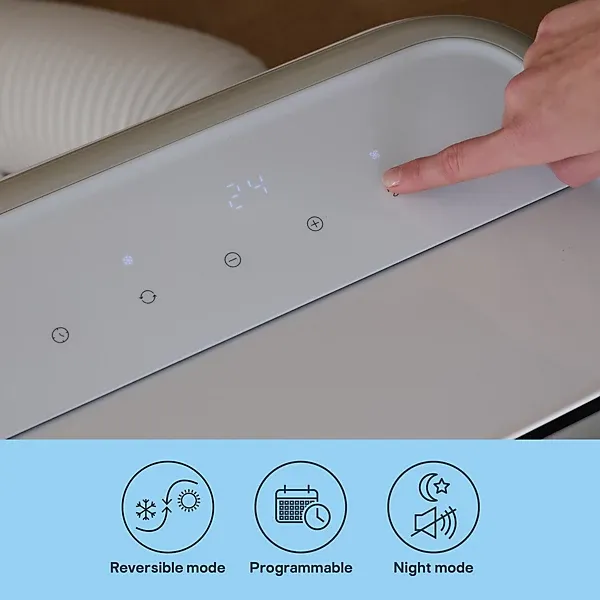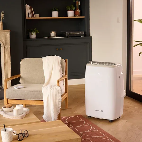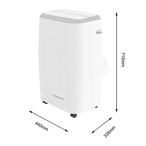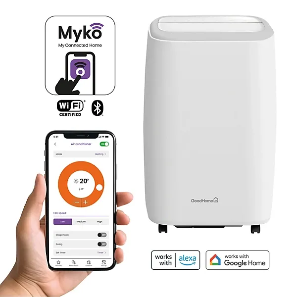 Introducing the portable GoodHome 12K BTU Smart Air Conditioner, for maintaining the perfect temperature in your home all year round. With its 4-in-1 function – cooling, heating, dehumidifying and ventilation – this air conditioning unit ensures optimal comfort in any season. Effortlessly control the climate of your home using the free Myko app, voice assistant or remote control. Experience the convenience and efficiency of the GoodHome 12K BTU Smart Air Conditioner today.