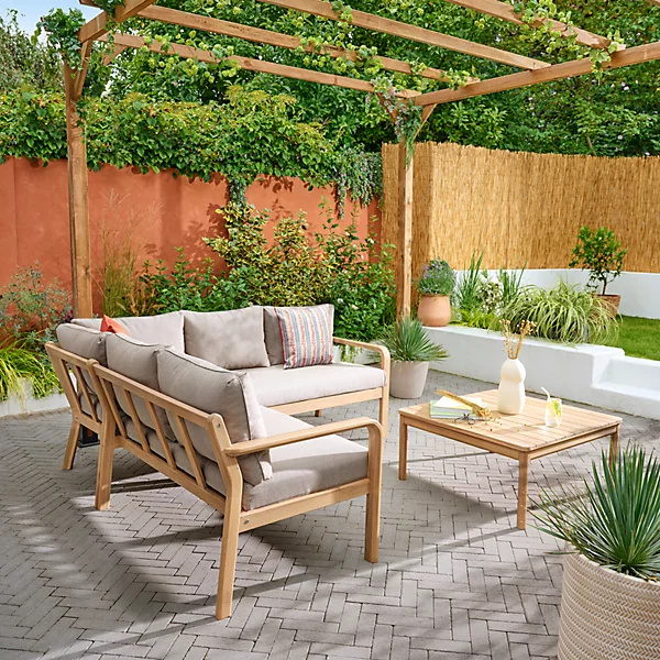 Transform your outdoor space with the GoodHome Riveo coffee set. Designed for ultimate relaxation, this set comfortably seats up to 5 people, creating the perfect corner to unwind and enjoy the sun. The high wraparound backrest offers support for those lazy, sun-filled afternoons, making it the ideal spot for leisurely meals or moments of peace. Complete the look with other pieces from the Riveo range.