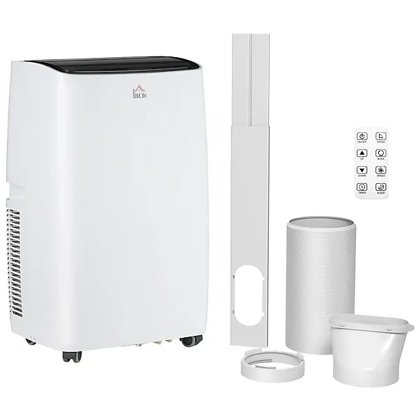 A multi-use piece – this HOMCOM portable air conditioning unit comes with three functions: cool, dehumidify and fan. Three speed levels and 15-31℃ adjustable temperature to set to what suits you. Four swivel wheels and side handles to move around easily. The LED screen panel controls the air conditioning unit – also comes with a remote. Maximum cool: 14000 BTU/h. Liquid drainage pipe included. Window kit included to work with sliding doors.