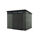 The Keter 9’x 7′ Cortina Heavy Duty Plastic Pent Shed – Green is modern in every way. With a slanted roof above a band of windows, it boasts a sleek, contemporary design that stores your belongings in eye-catching style. Its double layered walls are made from Evotech, our innovative composite material that gives you the aesthetic look and feel of wood but with the benefits of resin.