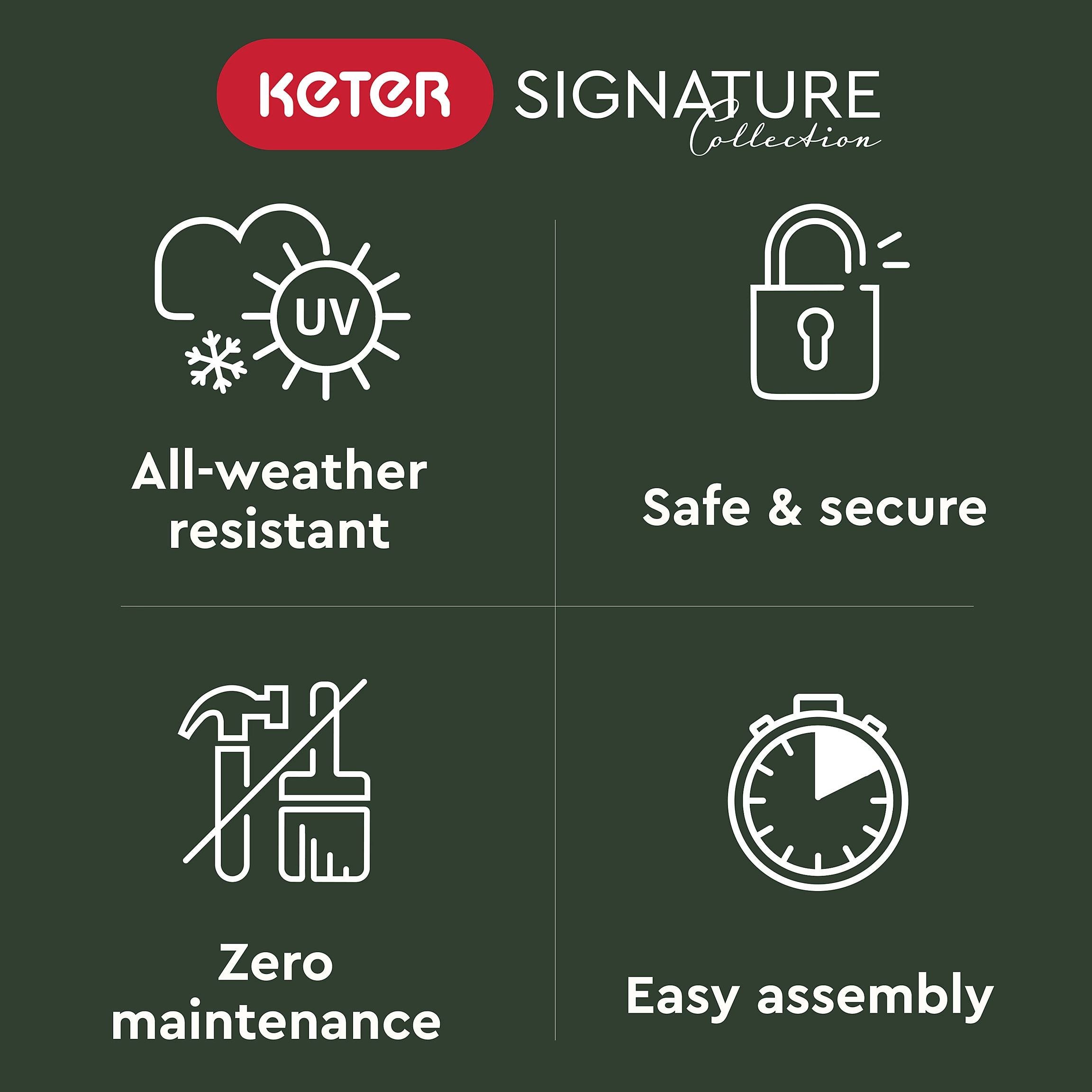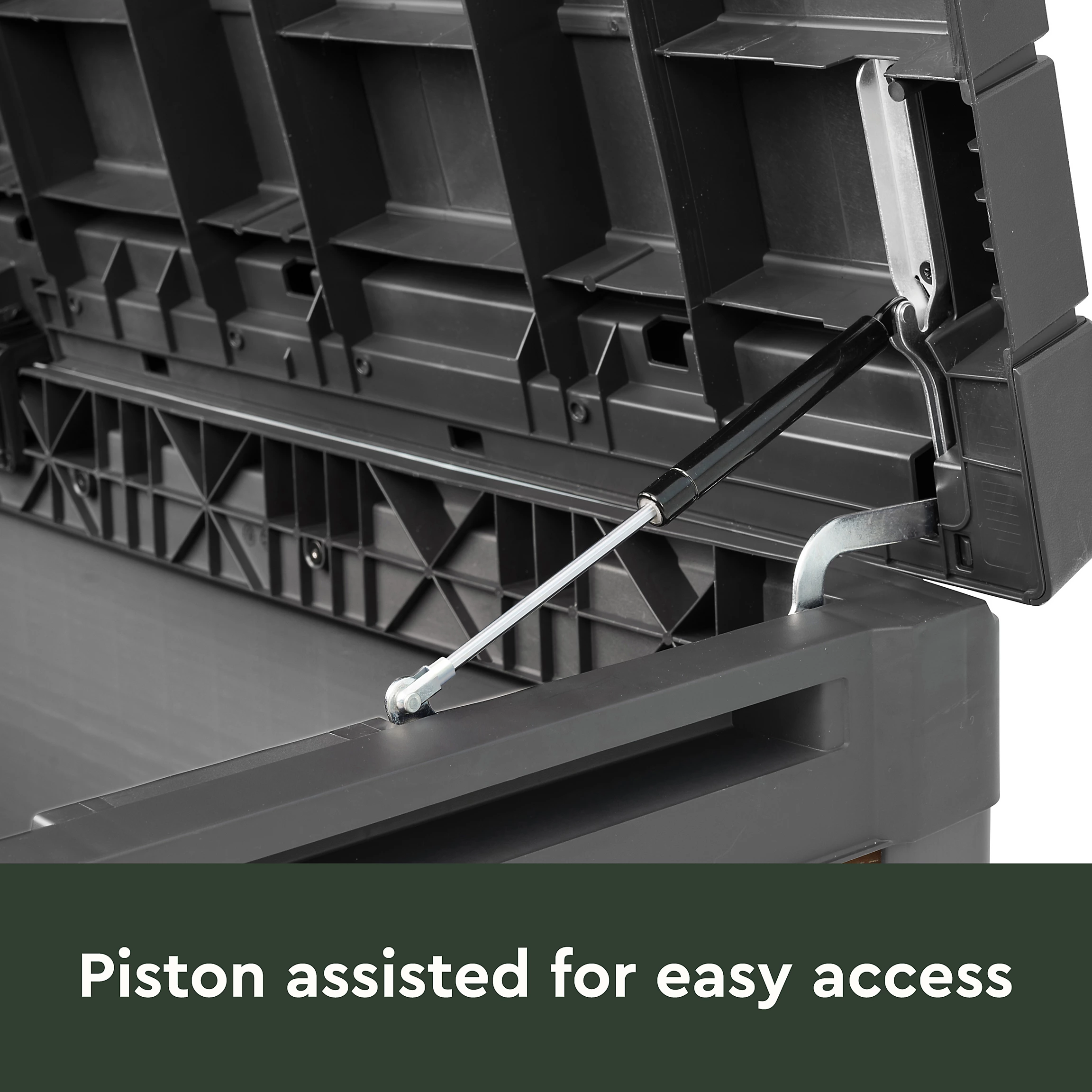 Keter’s Walnut 200G outdoor storage box will draw a lot of attention with its warm, dark, and even rustic-looking exterior at home on your patio, garden, or wherever you entertain guests. No need to place it out of sight in the garden; like every piece in our Signature Collection line, Walnut 200G is designed to be seen and built to serve your family for many, many years. Durable, waterproof, weather resistant, UV protected, and maintenance-free this is storage that enhances every space it’s placed in. It features a dual piston system for quiet and safe operation, and it’s also lockable to keep everything you store in it safe and secure.