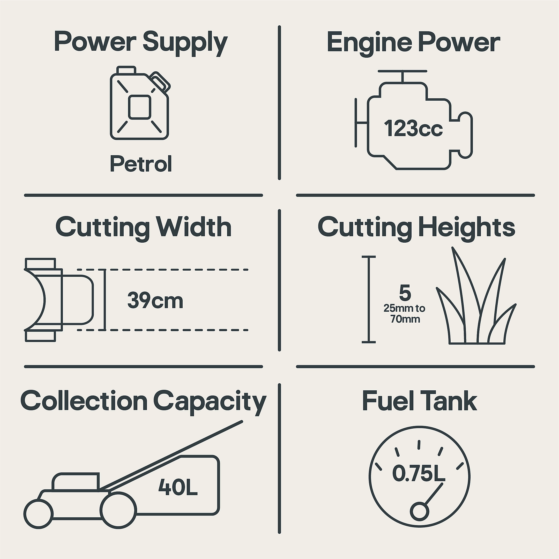 - Self propelled, ideal for maintaining your lawn with minimum effort, particularly if your lawn has slopes
